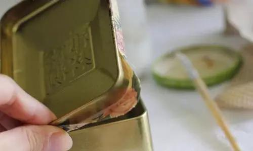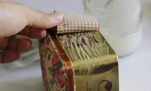 4、表布拐角處剪牙口,鐵盒邊緣涂上白膠,仔細按壓。