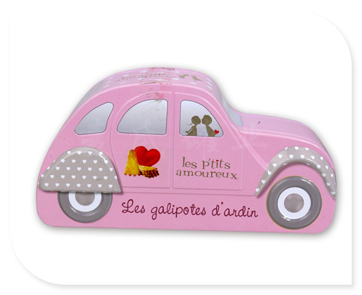 此款汽車形馬口鐵皮盒表面印刷為單面印刷,為CMYK四色+PSM專色處理,鐵盒外觀造型為小汽車形設計,版面整潔簡單,適合包裝各種精美禮品包裝,優雅簡潔的設計風格,能符合兒童年青時代包裝的需求。此款